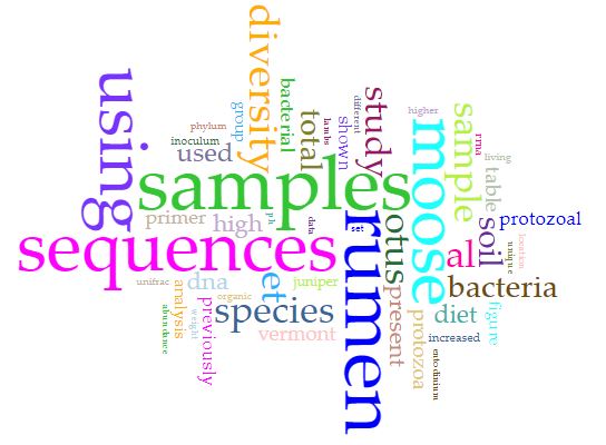 Insight into the bacterial gut microbiome of the North American moose (Alces alces), was written in 2012 and published in BMC Microbiology, which does not have a word limit. According to Voyant, the document contains 5,904 total words and 1,489 unique word forms. Vocabulary Density, the ratio of the number of words in the document to the number of unique words in the document, is 0.252. A lower vocabulary density indicates complex text with lots of unique words, and a higher ratio indicates simpler text with words reused. Average Words Per Sentence is 27.1, and Most frequent words are: rumen (80); otus (68); samples (67); moose (54); colon (50)..