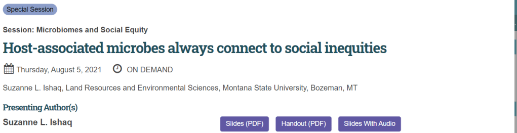 Citation: The Microbes and Social Equity Working group, “Special Session 17: “Microbiomes and Social Equity” (19205).”, Ecological Society of America 2021. (virtual). Aug 5, 2021.