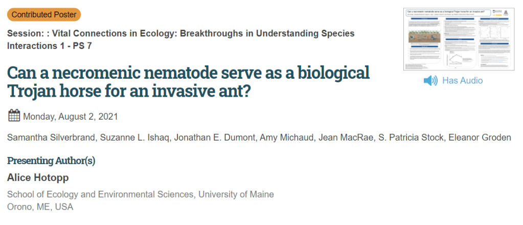Poster Citation: Hotopp*, A., Silverbrand, S., Ishaq, S.L., Dumont, J., Michaud, A., MacRae, J., Stock, S.P., Groden, E. “Can a necromenic nematode serve as a biological Trojan horse for an invasive ant?” Ecological Society of America 2021. (virtual). Aug 2-6, 2021. (poster)