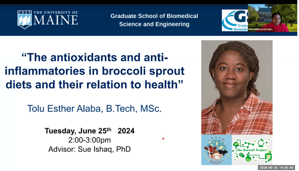 The Ishaq Lab is delighted to announce that Tolu Esther Alaba will soon be defending her PhD dissertation on the antioxidants and anti-inflammatories in broccoli sprout diets and their relation to health. Her dissertation will be presented over Zoom on June 25, 2024, from 2 – 3 pm EDT, which is open to the public. Registration is free but required here.