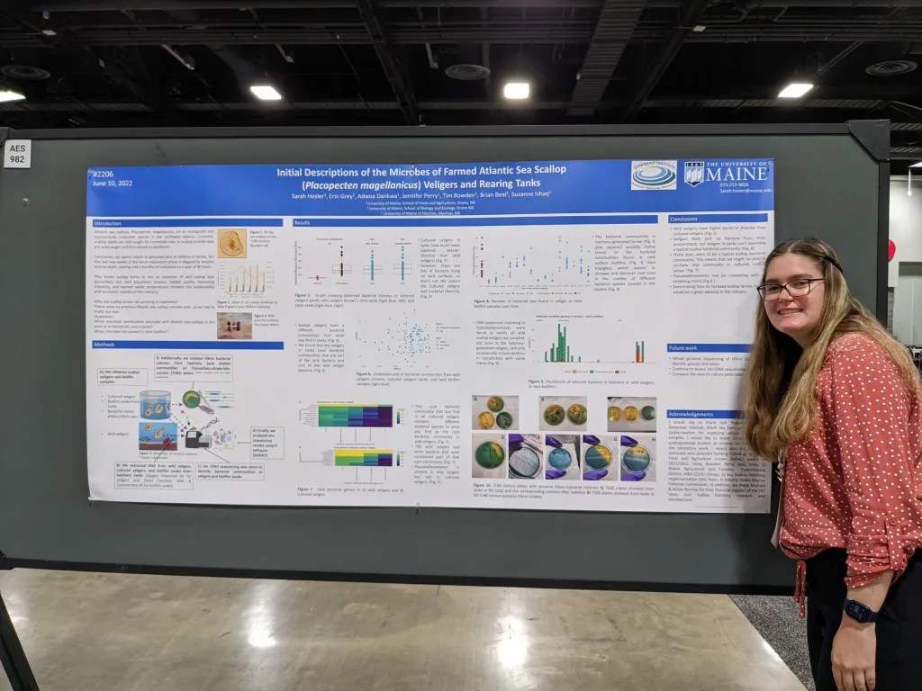 The third project project, and primary focus of her second year, investigated the microbial communities associated with sea scallops at different life stages and associated with tank surfaces at different points in a hatchery production run. Overall, there is a dramatic lack of research into the microbial communities involved in aquaculture and fisheries and how these might impact production as well as local ecosystems. Sarah processed a large number of samples for DNA extraction and sequencing preparation, as well as microbial culturing and biofilm assessment, and trained an undergraduate on the culturing work. This project and the piloting work Sarah did has led to a small grant award and a multiple-institutional collaboration. Sarah presented some of this preliminary work to aquaculture and fisheries industry professionals at the Northeast Aquaculture Conference & Exposition/ 41st Milford Aquaculture Seminar in Portland, and the American Society for Microbiology Microbe meetings. Sarah is currently writing this manuscript which will be submitted for peer review by the end of this summer.