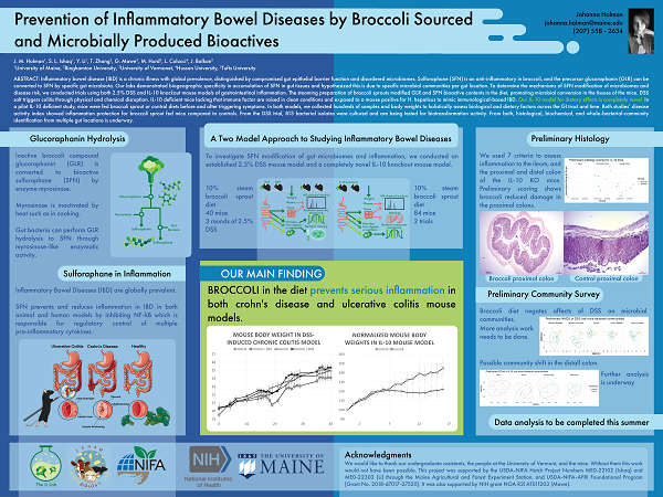 Johanna’s project focuses on whether consumption of specific broccoli sprout preparations will elicit changes in the gut microbiota, to the effect of improving the production of microbiota-specific bioactives that have local anti-inflammatory effects, and promoting intestinal homeostasis by reducing dysbiosis. Broccoli sprouts represent an effective, and accessible way to add dietary intervention to existing treatment and prevention strategies for IBD patients. This project is a continuation of previous research on bioactive compounds in broccoli, completed in the labs of Drs. Yanyan Li and Tao Zhang at Husson University in Bangor. While some of the work may be similar, the skill set she has gained in her graduate work is entirely new. For the 2020/2021 winter break, Johanna was managing a 40-mouse study looking at DSS-treatment and different preparations of a broccoli sprout diet for 5 weeks, which resulted in hundreds of samples collected, hundreds of data time points, and enough follow-up laboratory and analysis work to keep her occupied for an entire year. She has learned how to culture bacteria in an anaerobic chamber, which is a notoriously fussy machine that requires regular attention, as well as to grow them under different conditions for biochemical analysis and enzyme activity. She is currently learning additional histology skills, DNA extraction, DNA sequencing library preparation, DNA sequence analysis, and more. Recently, she has participated in a pilot study to develop an immunological model of IBD, using IL-10 knockout mice. While IL-10 mice have been used to study IBD, they have never been applied in this way to study the interaction of diet, microbes, and disease.