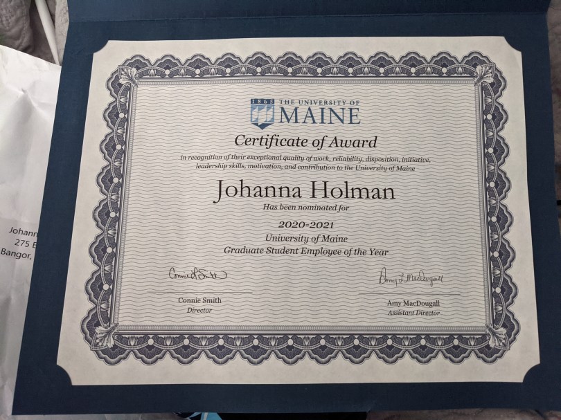 Johanna and I continued to plan her graduate work and career goals, she officially joined my lab as a Master’s Student of Nutrition at UMaine in fall 2020, and immediately got to work. Not only did she begin preparations for the massive undertaking that is part of her project, but she began mentoring several undergraduates on and off campus, and started as a first time teaching assistant for the Chemistry department, which required navigating virtual labs. She served as a chemistry TA for academic year 20/21 and 21/22, with up to 60 students per semester. For the last year and a half, she has been coordinating a large-scale research project with investigators at 4 different institutions and undergraduate researchers from 3 different institutions, involving hundreds of samples – while being a masters student, a graduate teaching assistant, and mentoring undergrads in the lab, and all during a pandemic! She managed that all so well, that despite being a first-year graduate student, she was awarded a 2020-2021 University of Maine Graduate Student Employee of the Year award, and the 2022 Norris Charles Clements Graduate Student Award from the College of Natural Sciences, Forestry, and Agriculture.
