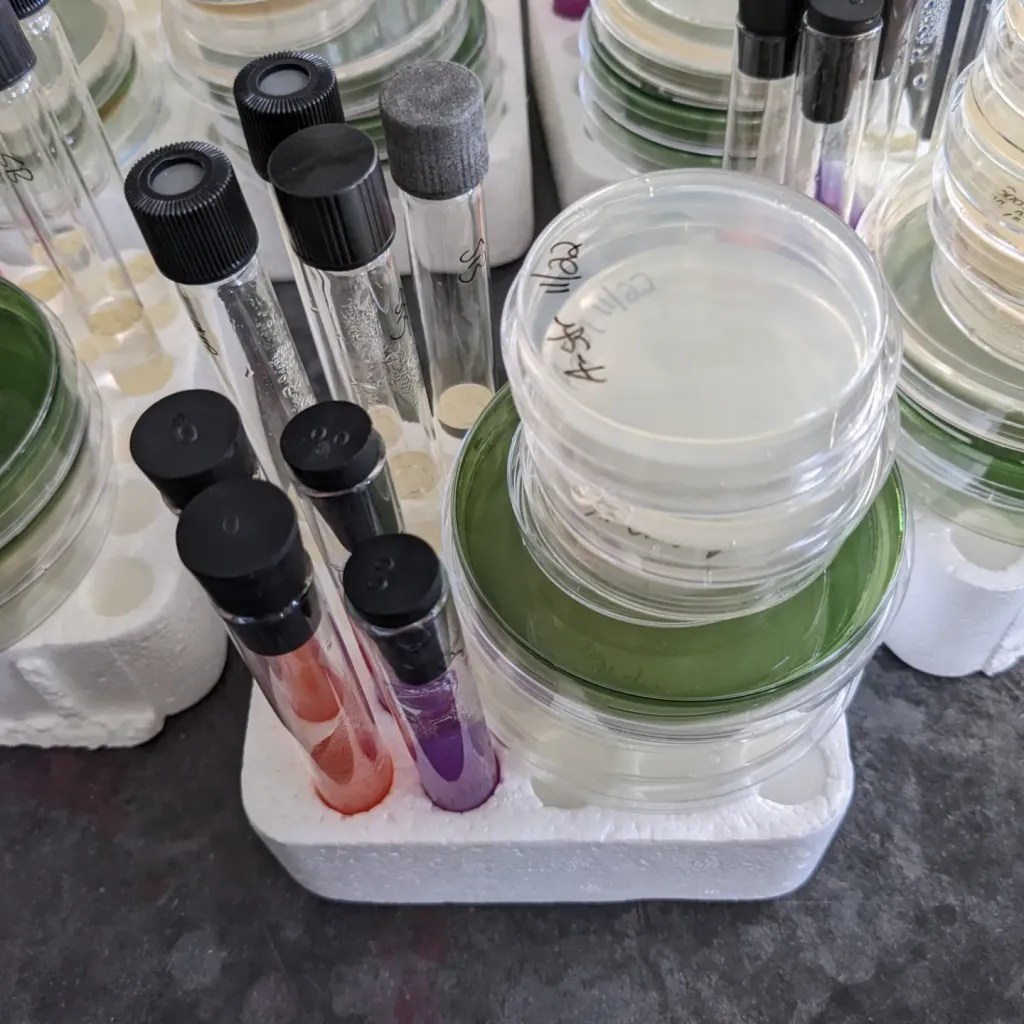 In 2021, the Ishaq Lab, collaborators at UMaine, and collaborators at the Downeast Institute ran a pilot project to investigate the bacteria that associate with sea scallop larvae in hatcheries, and how this is develops in relation to bacteria in hatchery tanks over time. For that project, we collected hundreds of culture plates with a specialized media that selects for certain species of bacteria.