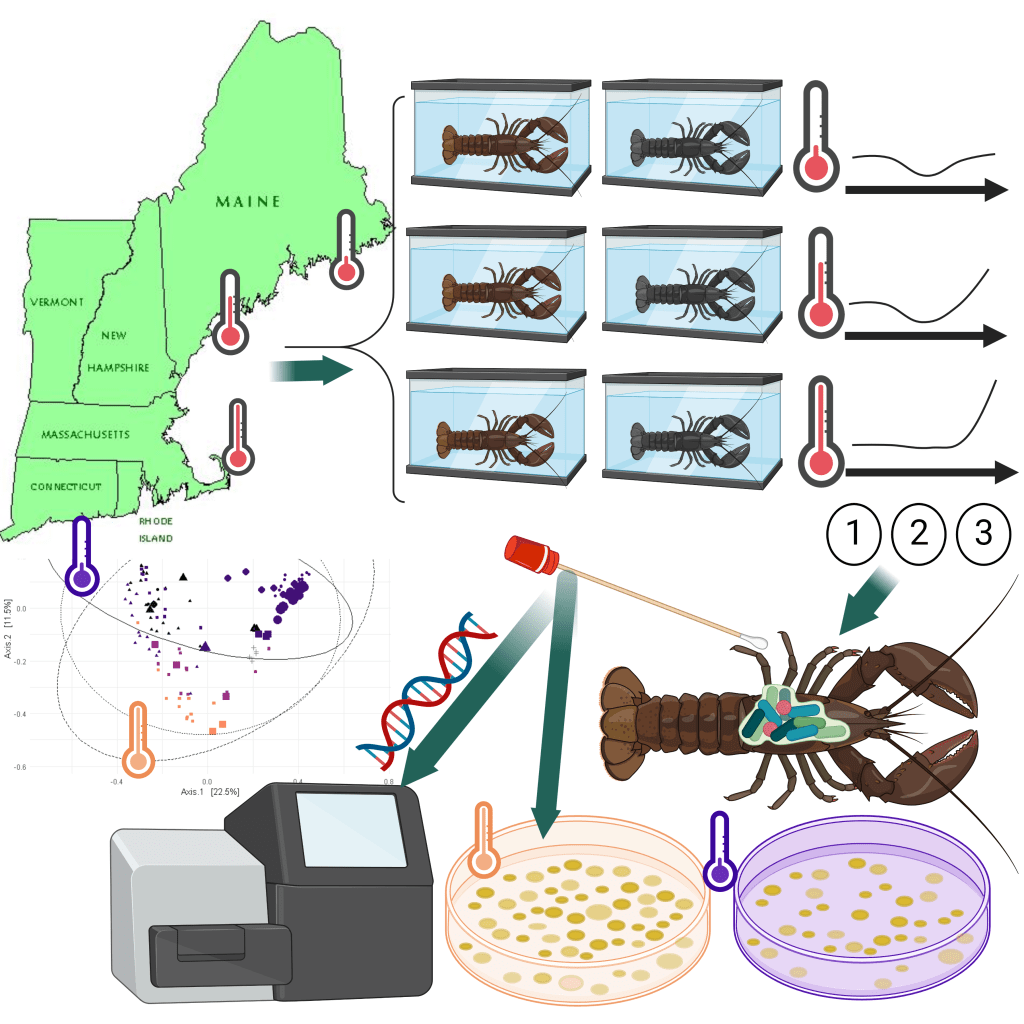 A collaborative paper on lobster shell bacteria has just been published in the journal iScience: “Water temperature and disease alters bacterial diversity and cultivability from American Lobster (Homarus americanus) shells.” This paper investigates what happens to bacterial communities on healthy and sick lobsters as they experience different water temperatures for a year.