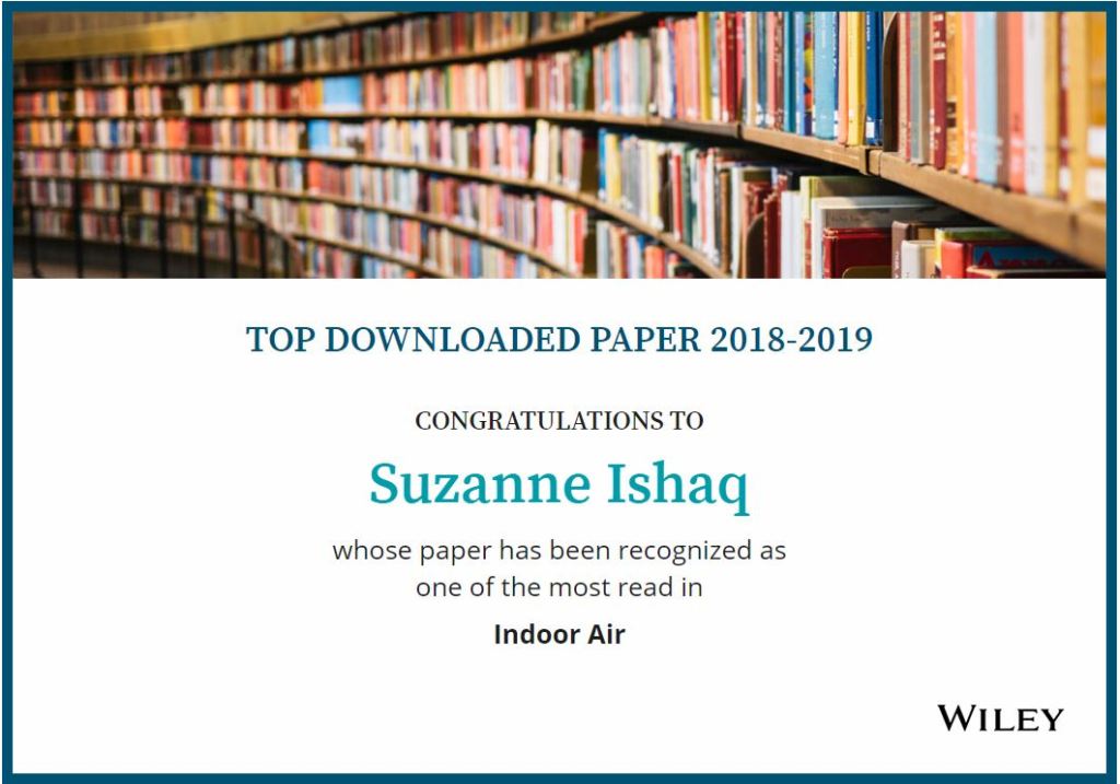 A collaborative review article that I was last author on was listed in the top 10% most downloaded papers of 208/2019 in the journal Indoor Air! Even more impressive, this review was published August 20, 2019, and it was still in the top 10% spanning from January 2019 – December 2019!!