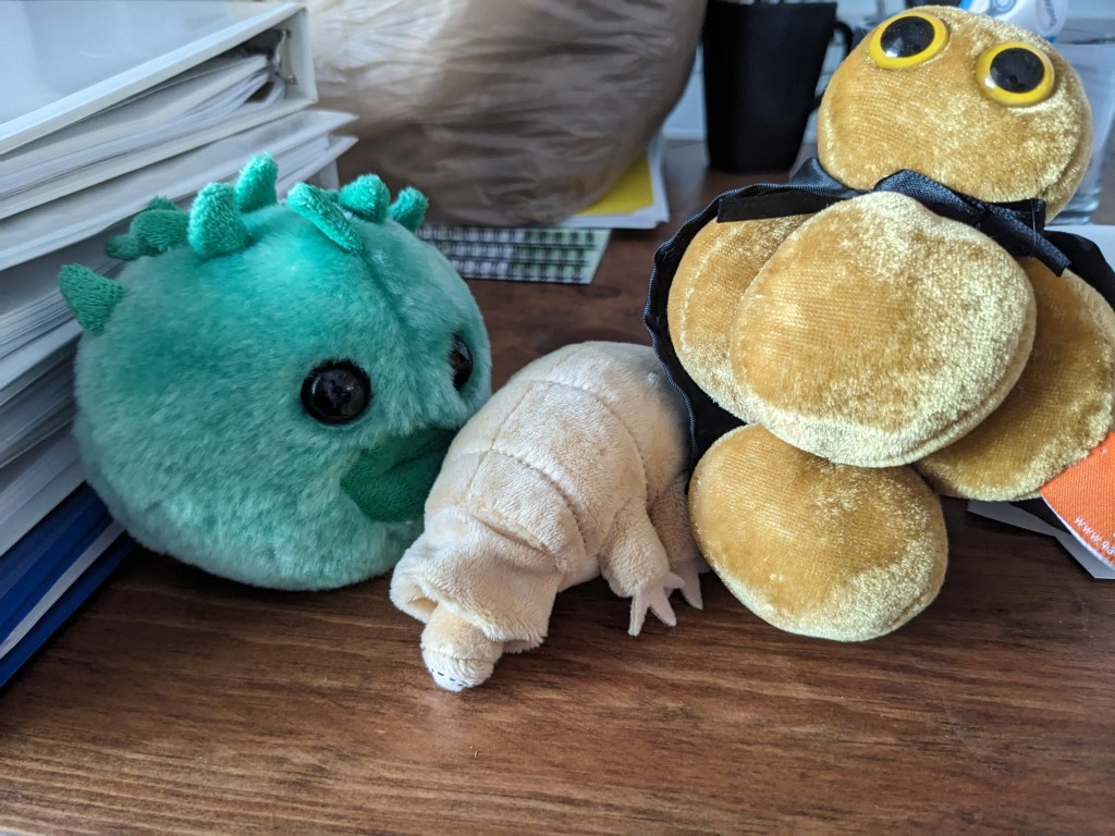 While visiting the Microbe Musuem in Amsterdam recently, Alexis got me a tardigrade (middle) to join the chalmydia (left) and methicillin-resistant Staphylococcus aureus (right, which she got me last year) in my office!