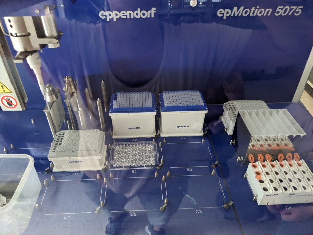 Because of the large number of samples, we are using a robotic liquid handler to dispense culture media and bacterial cells into 96-well plates, that we can later look for growth in. We’ll also be using the anaerobic chamber to grow these bacteria on agar plates to see what their colonies look like, and to grow more of them for additional experiements.