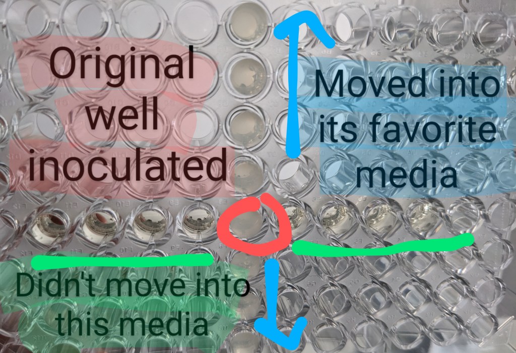 Johanna has been leading a team of students (Alexis Kirkendall, Lilian Nowak, Aakriti Sharma, and Jaymie Sideaway) on a culturing project to screen hundreds of bacterial isolates that were collected from the gastrointestinal tracts of mice eating borccoli sprouts. We are testing them for their capacity to metabolize different glucosinolates into anti-inflammatory compounds, as well as grow on different media types. In the process, we found that the bacteria we are using as a positive control likes to move from one test well to another when its favorite media is available — but not when glucose is present.